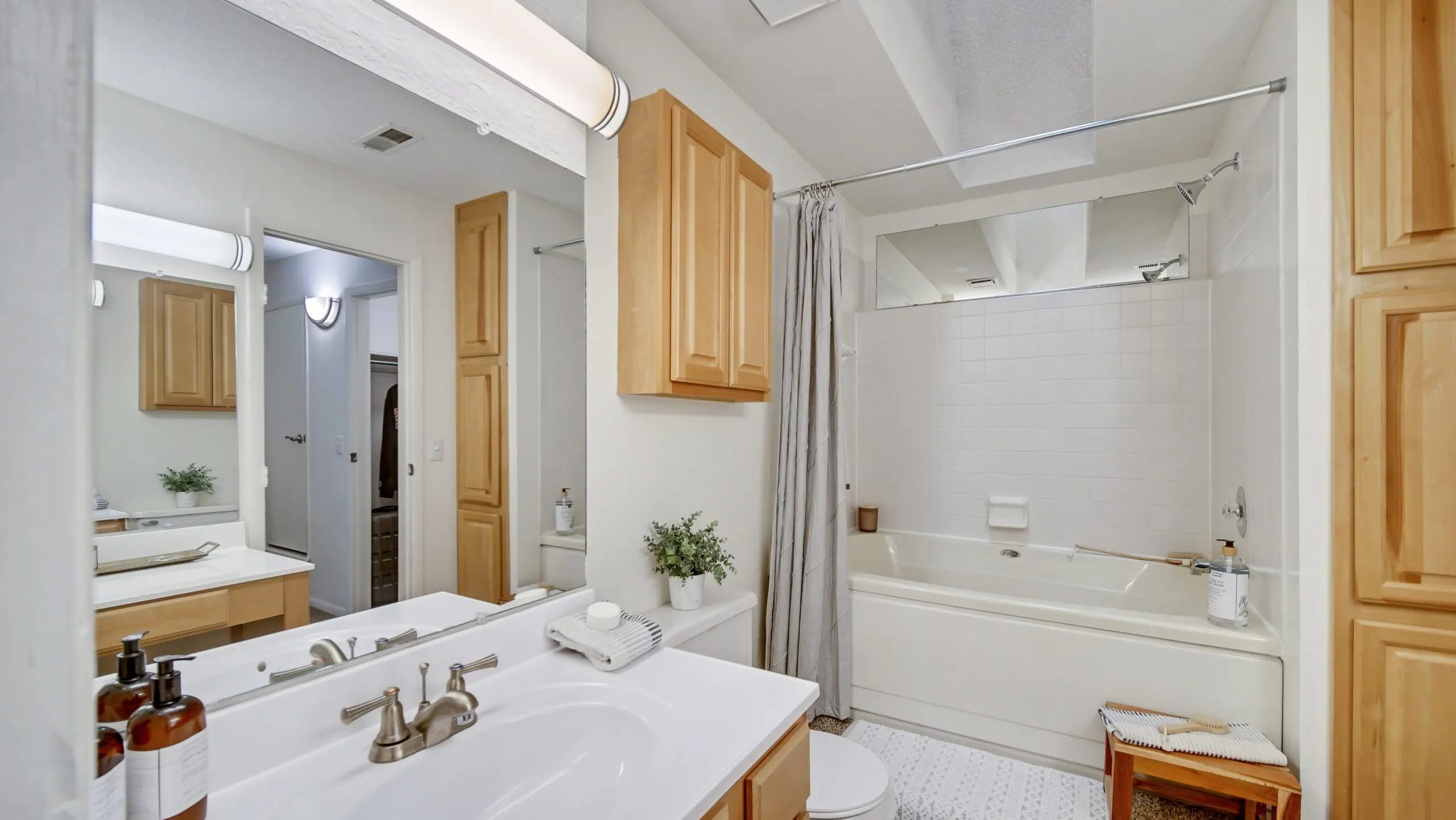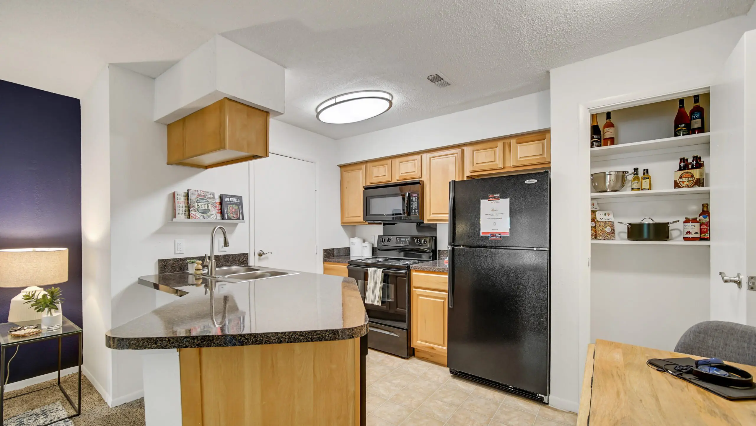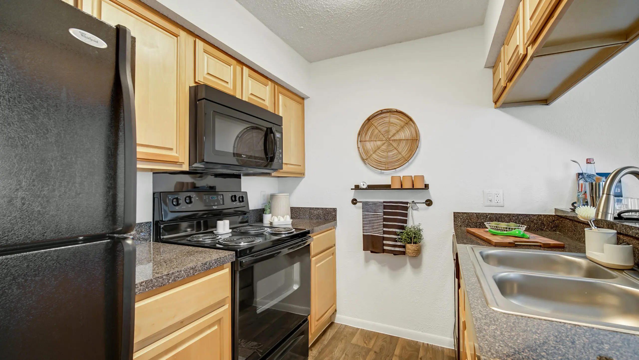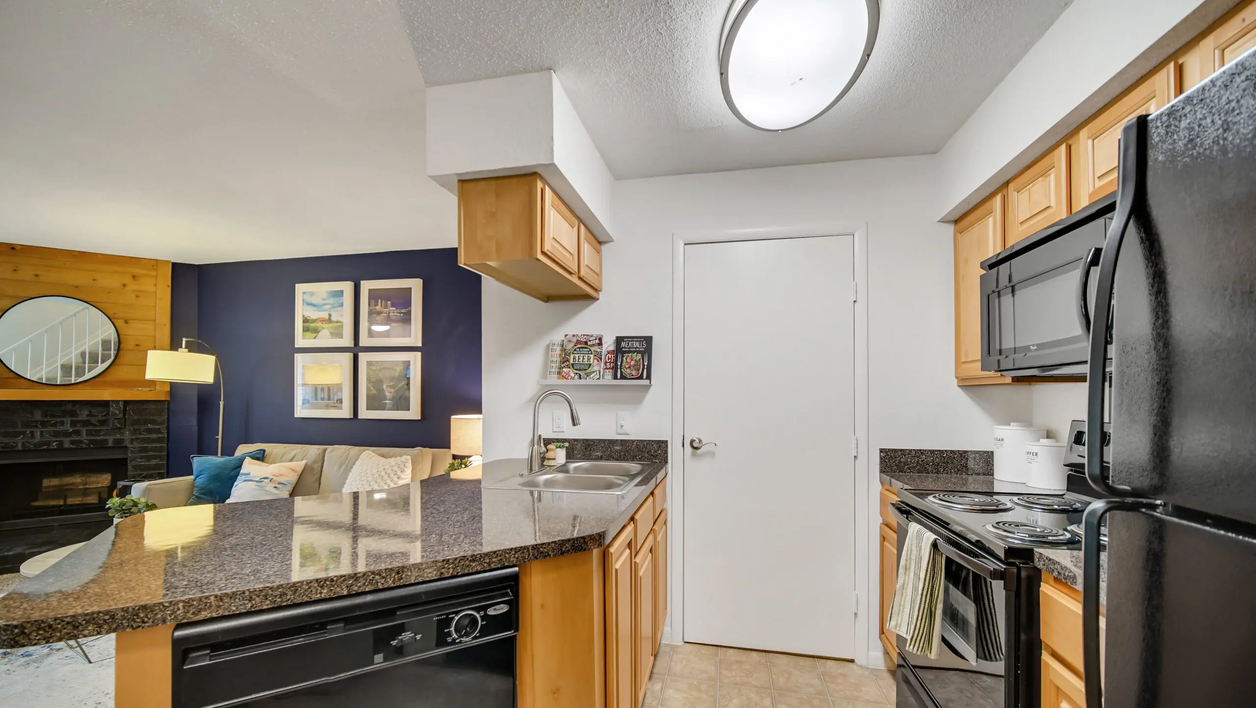 Our unique 1 and 2 bedroom apartment homes feature updated kitchens and baths, walk-in closets, recessed lighting, ceiling fans, modern black Whirlpool appliances, brushed nickel fixtures, full-size washer and dryers, and private balconies or patios. In select apartment homes you’ll find delightful features such as wood-burning fireplaces, lake views, vaulted ceilings, and Jacuzzi tubs.